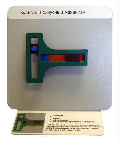 Модель действующего кулисного синусного механизма предназначена для демонстрации получения с помощью данного механизма функции синуса и косинуса.
