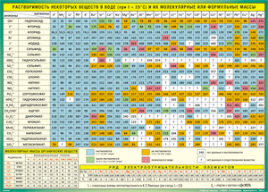 Таблица "Растворимость некоторых веществ в воде при t=25°C и их молекулярные массы новинка" (100х140 сантиметров, винил)