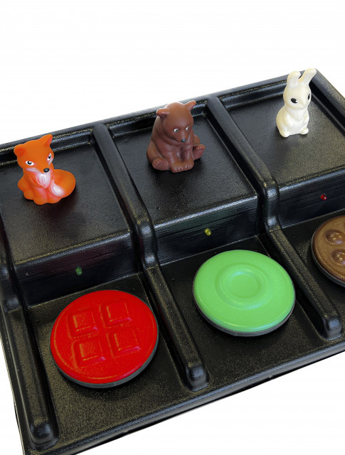 Коммуникатор этой модели имеет 2-х ступенчатую конструкцию: на нижней ступени расположены кнопки, верхняя же предназначена для размещения объемных предметов для изучения. Держатели для карточек в количестве 3 штуки помогают размещать и демонстрационные картинки с надписями или без, а также слова. Для каждой кнопки можно записать по одному сообщению до десяти секунд каждое. Данный аппарат подходит для проведения занятий по любому предмету, в котором могут быть задействованы наглядные материалы. При нажатии на кнопку сообщение воспроизводится и загорается свет. Подобные устройства имеют большую популярность во многих реабилитационных и коррекционных учреждениях нашей страны. Они во многом упрощают работу специалистов и делают ее более эффективной. Что касаемо людей с ограниченными возможностями, коммуникаторы способны подарить им веру в собственные силы, которая побуждает их развиваться и достигать новых высот.