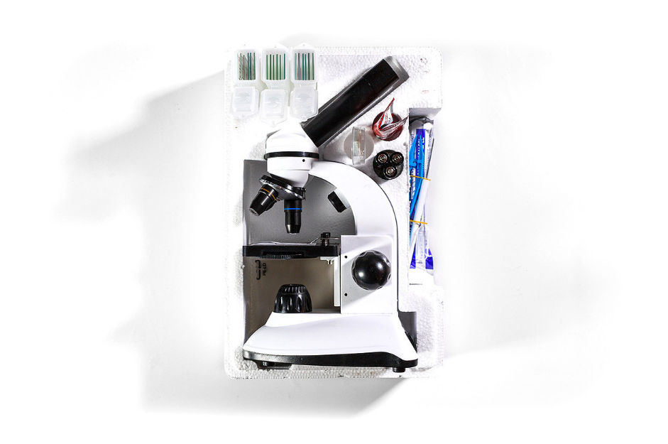 Микроскоп – это комбинация двух линз – объектива, направленного на объект, и окуляра, в который смотрит исследователь. У нас линза окуляра увеличивает в 10 раз. Окуляр можно вынуть и использовать как лупу. Объективов у вашего микроскопа три – 4х-, 10и- и 40- кратные. Они крепятся на специальной турели, чтобы их можно было легко менять. Если перемножить значения увеличений окуляра и объектива, получим общее увеличение микроскопа: в 40, 100 и 400 раз. Чем больше увеличение, тем меньше рассматриваемый участок, а значит, тем меньше света попадает с него в объектив. Поэтому препараты нужно хорошо освещать. В микроскопе из набора "Мир Левенгука" есть два типа освещения – верхнее и нижнее. Верхний свет используется только при работе с малым и средним увеличением. Он нужен для того, чтобы показать поверхность толстых срезов и непрозрачных препаратов (например, куска кирпича). Нижний свет подходит для прозрачных объектов (например, капель воды) и тонких срезов. Использовать его можно на всех трех увеличениях. Готовые препараты, вложенные в этот набор, лучше рассматривать под нижним светом.