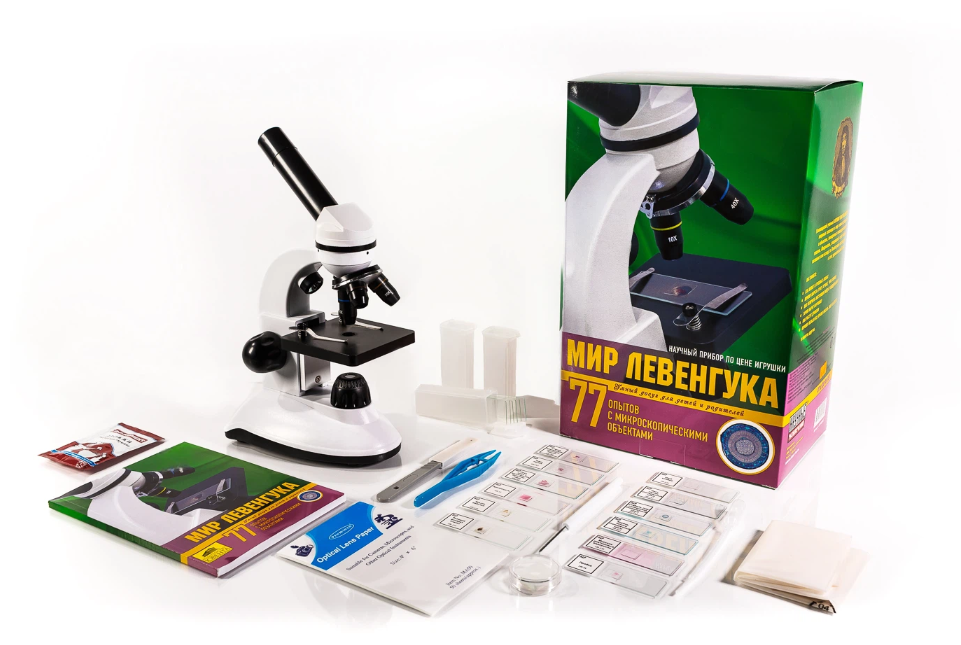 Набор «Мир Левенгука» позволяет заглянуть в таинственный и захватывающий мир микроорганизмов, узнать о том, как устроены растения, животные и грибы. Набор расчитан на широкую аудиторию от 8 до 99 лет и даже старше.