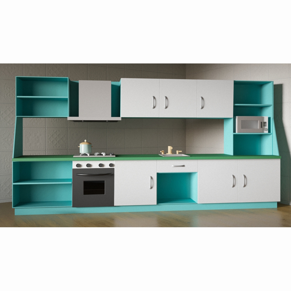 Детская кухня «Эльвира» окрашена в нейтральные бело-голубые тона, что позволяет поместить ее в любое помещение, не опасаясь того, что она может не подойти или будет неуместно выделяться. Фасад изготовлен из прочного материала высокого качества – это обеспечит долгое пользование без потери привлекательного внешнего вида.