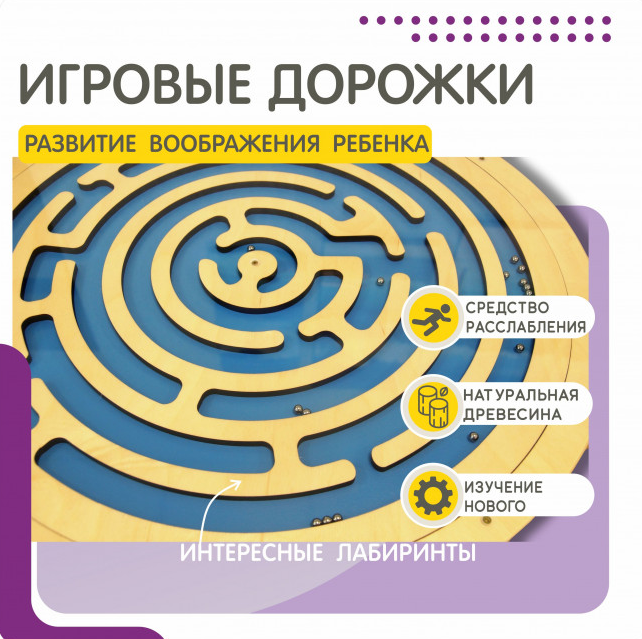 Бизиборд-лабиринт – это игровой модуль, который помогает развивать моторику и логическое мышление у детей от 3-х лет. Основание модуля выполнено из древесины и имеет круглую форму. По всей поверхности основания расположен огромный лабиринт с металлическими шариками, который не только развивает мелкую моторику, но и улучшает координацию движений рук и глаз.