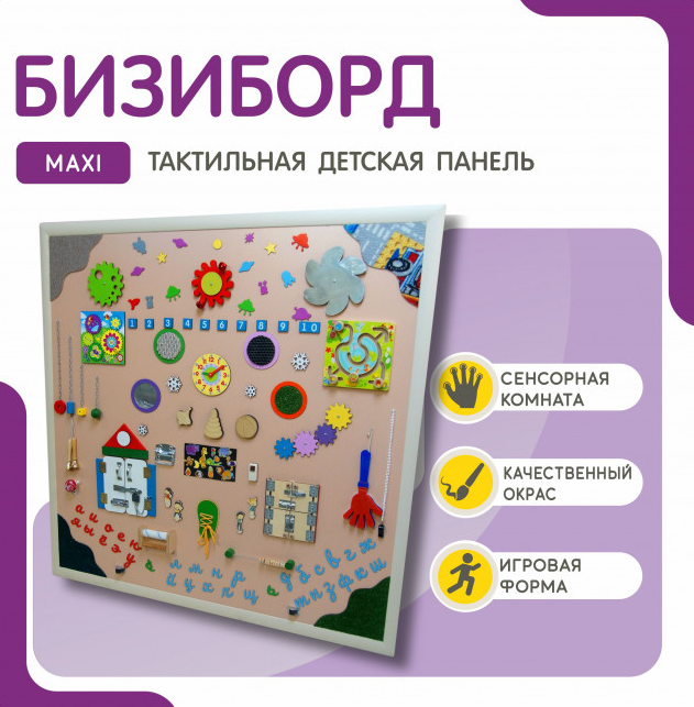 - Тактильный и эмоциональный опыт. Бизиборд МАКСИ дает возможность ребенку не только развиваться, но и получать удовольствие от игры, благодаря приятной текстуре дерева, колокольчикам и тактильным областям.