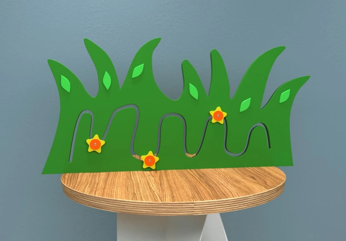 Настенная панель в виде травы является по сути наипростейшим тактильным лабиринтом с минимальной игровой ценностью. Вместе они образуют игровой комплект для детей от 1 года. Оба элемента крепятся к стене. Основа настенной панели выполнена в форме рядочка зелёной травки, на котором размещён тактильный лабиринт с передвижными элементами – цветочками. Помимо этого, панель украшена светло-зелёными листочками.