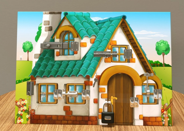 На деревянной панели изображен домик крупным планом, украшенный множеством различных элементов – можно хорошо рассмотреть окошки с голубыми стёклышками, и полукруглую деревянную дверь, и кирпичики на фоне выбеленных стен, и зелёную черепичную крышу с печной трубой и окошком чердака. Имеются и различные тактильные приспособления для игры. Поверхность отшлифована и покрыта безопасными лаком и краской.